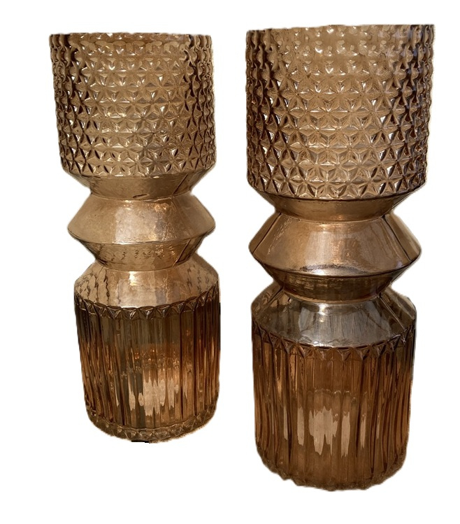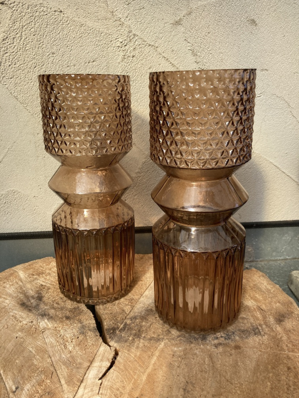 Dit is een stijlvolle glazen vaas in een trendy rookbruine kleur, die door zijn geometrische vormen en textuur doet denken aan de populaire designs uit de jaren 70.