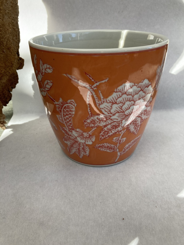 Leuke bloempot in de kleur oranje wit met bloemen decor naar Chinees voorbeeld.