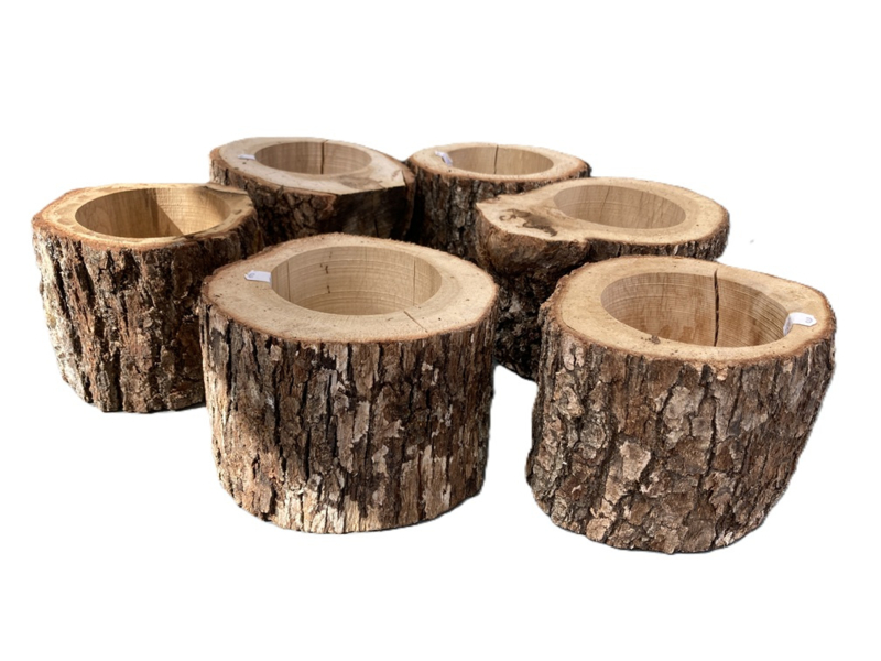 Van echt hout gemaakte bloembakjes, hierdoor is elk bakje anders van vorm en gewicht.