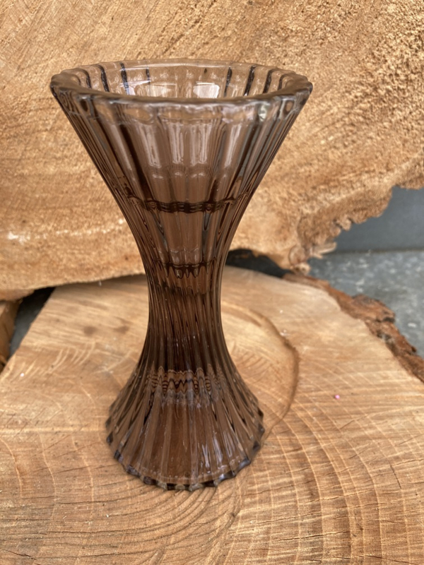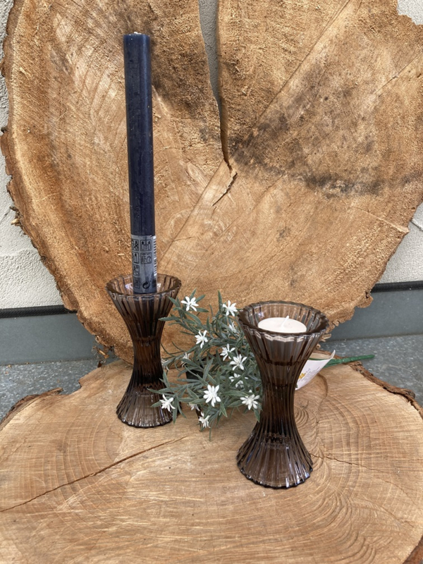 KANDELAAR RIBBEL SMOKEY GLAS DINER- WAXINELICHT 2 DLG