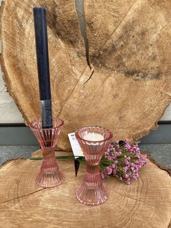 KANDELAAR RIBBEL ROZE GLAS DINER- WAXINELICHT 2 DLG